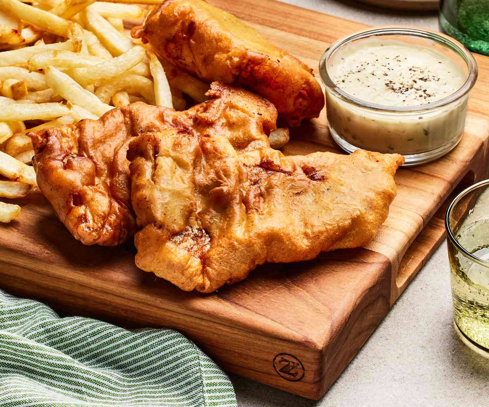 Gebakken krokante vis met patat geserveerd met ravigottesaus, frisse salade